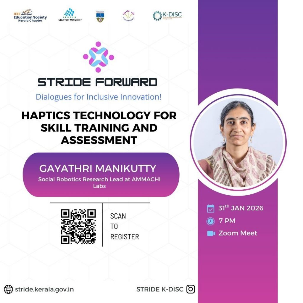 Organised by STRIDE (K-DISC) in association with IEEE Education Society Kerala Chapter, this session is part of STRIDE Forward, a dialogue series dedicated to advancing inclusive innovation through real-world research, technology, and impact-driven conversations.